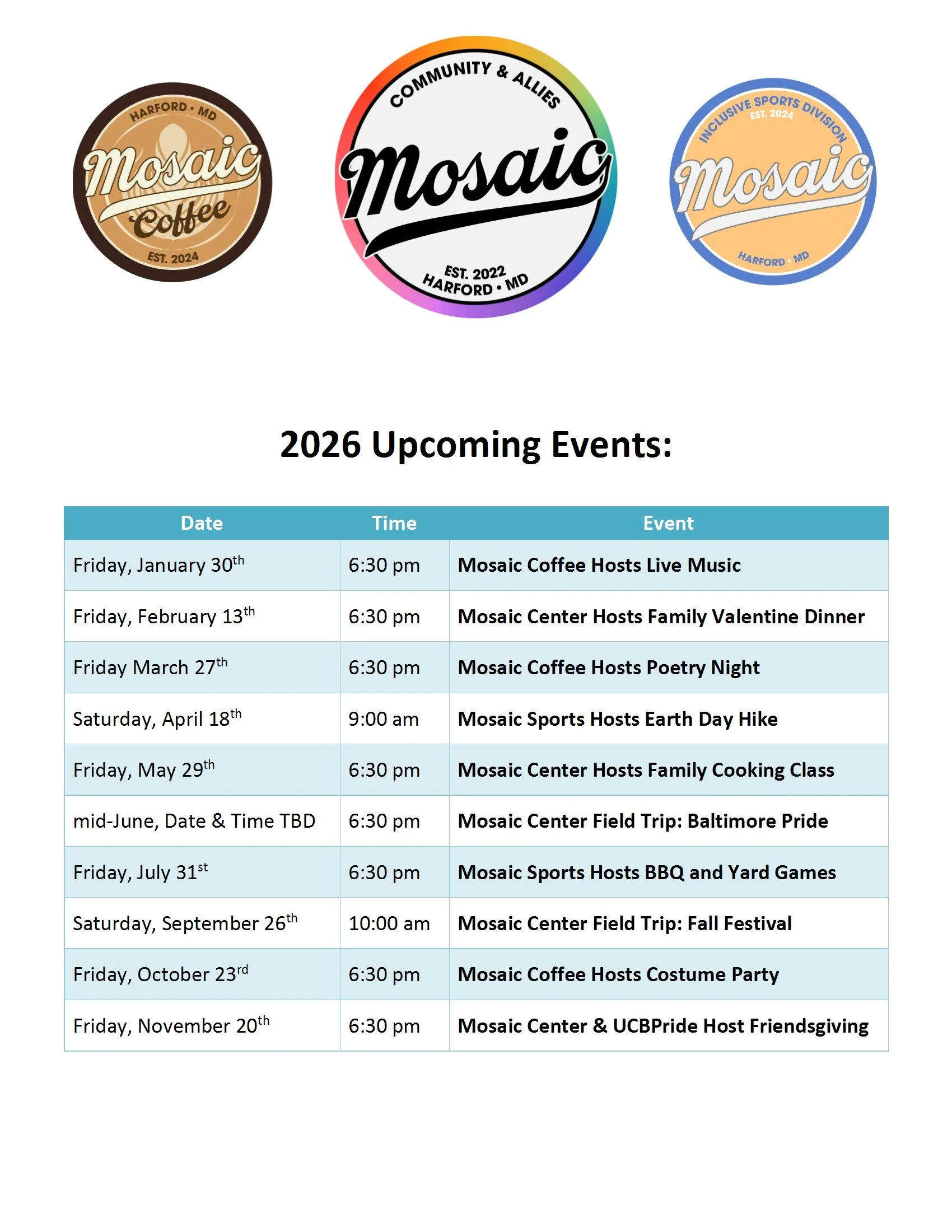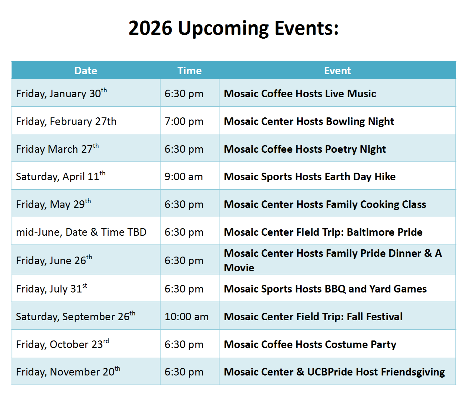 Check out our upcoming events below! The calendar is updated as events are added, so please check back regularly to see the latest updates.
